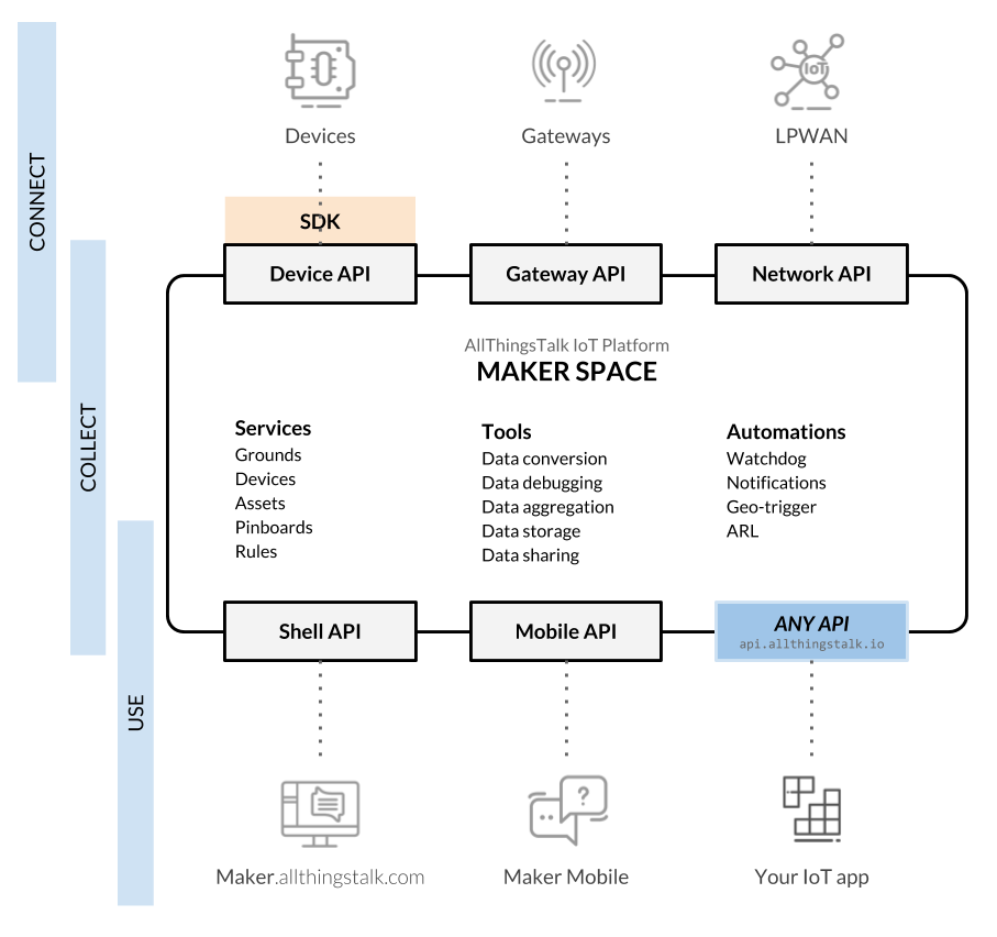 Maker is the web interface of the AllThingsTalk IoT Cloud. It allows you to explore the possibilities of the AllThingsTalk Cloud, connect your devices and build your own IoT prototypes.
