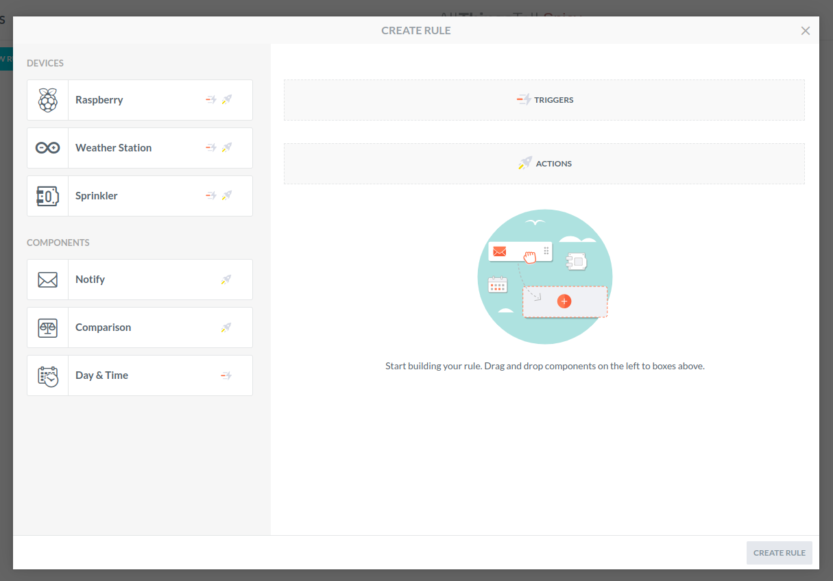 Pictured above is the AllThingsTalk Rule Designer, the drag and drop environment for creating rules. On the left, you will see the list of your devices and rule components, both of them representing pieces of functionality you can patch together to create complex behavior.