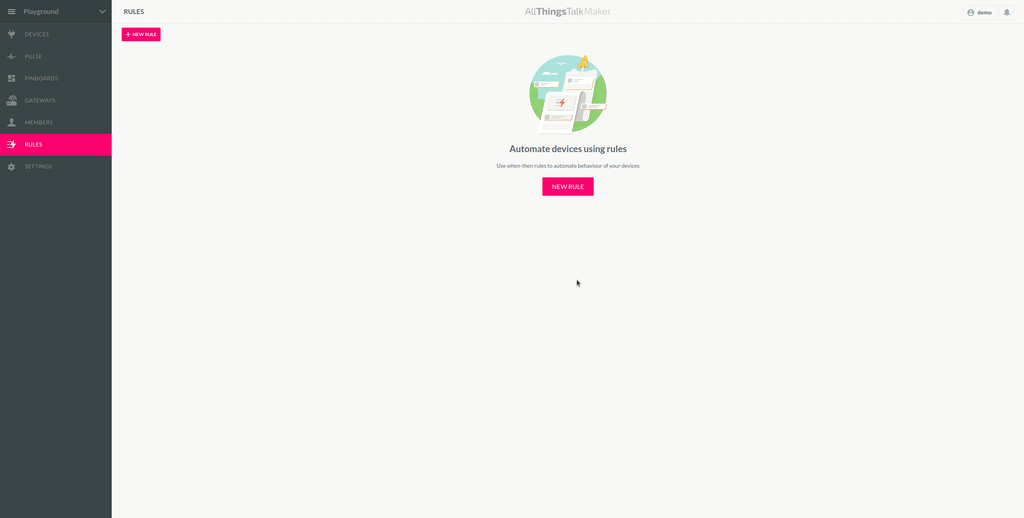 Like Devices, Pinboards, Gateways & Members, Rules are contained within a ground. This lets you use naturally separate rules belonging to different project, but also share and collaborate with other members. Read more about grounds