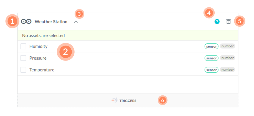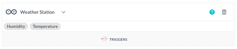 Using a device as a trigger lets you act whenever one or multiple assets change their state. This applies on assets of any type. In other words, whenever you want to create a rule that does something when a button is pressed, or when there’s a change in temperature, you will start by dragging a device of your choice to TRIGGERS