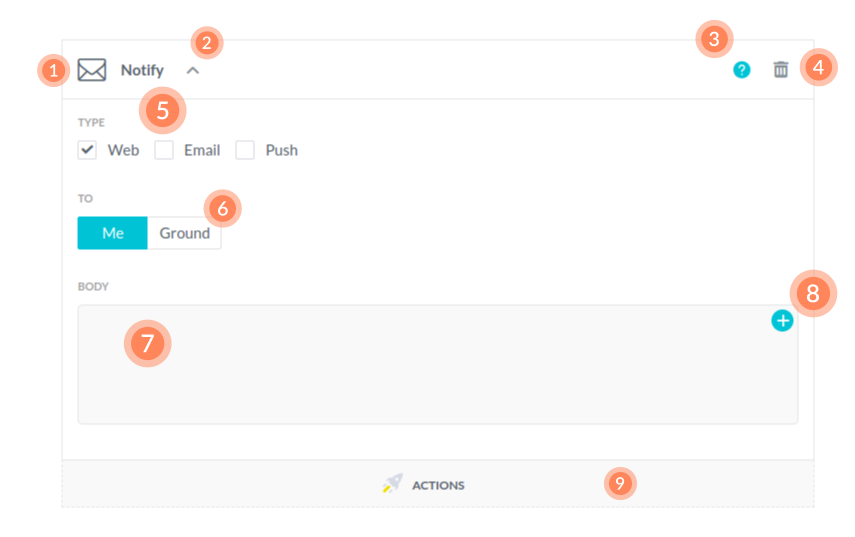 Notify component is used for sending notification when rule is triggered. There are three ways of sending notifications: 1) by web, 2) by email and 3) by push.